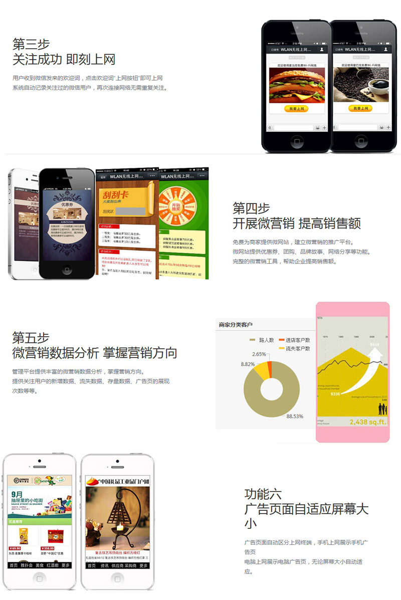 WIFI營銷的第三個(gè)階段,應(yīng)該是大數(shù)據(jù)階段,移動(dòng)互聯(lián)網(wǎng)產(chǎn)業(yè)研究院最近推出的微信營銷系統(tǒng),不僅有WIFI的基礎(chǔ)功能.同時(shí)增加了線下用戶的大數(shù)據(jù)分析.為不同層次的客戶,提供不同類型的廣告展示.